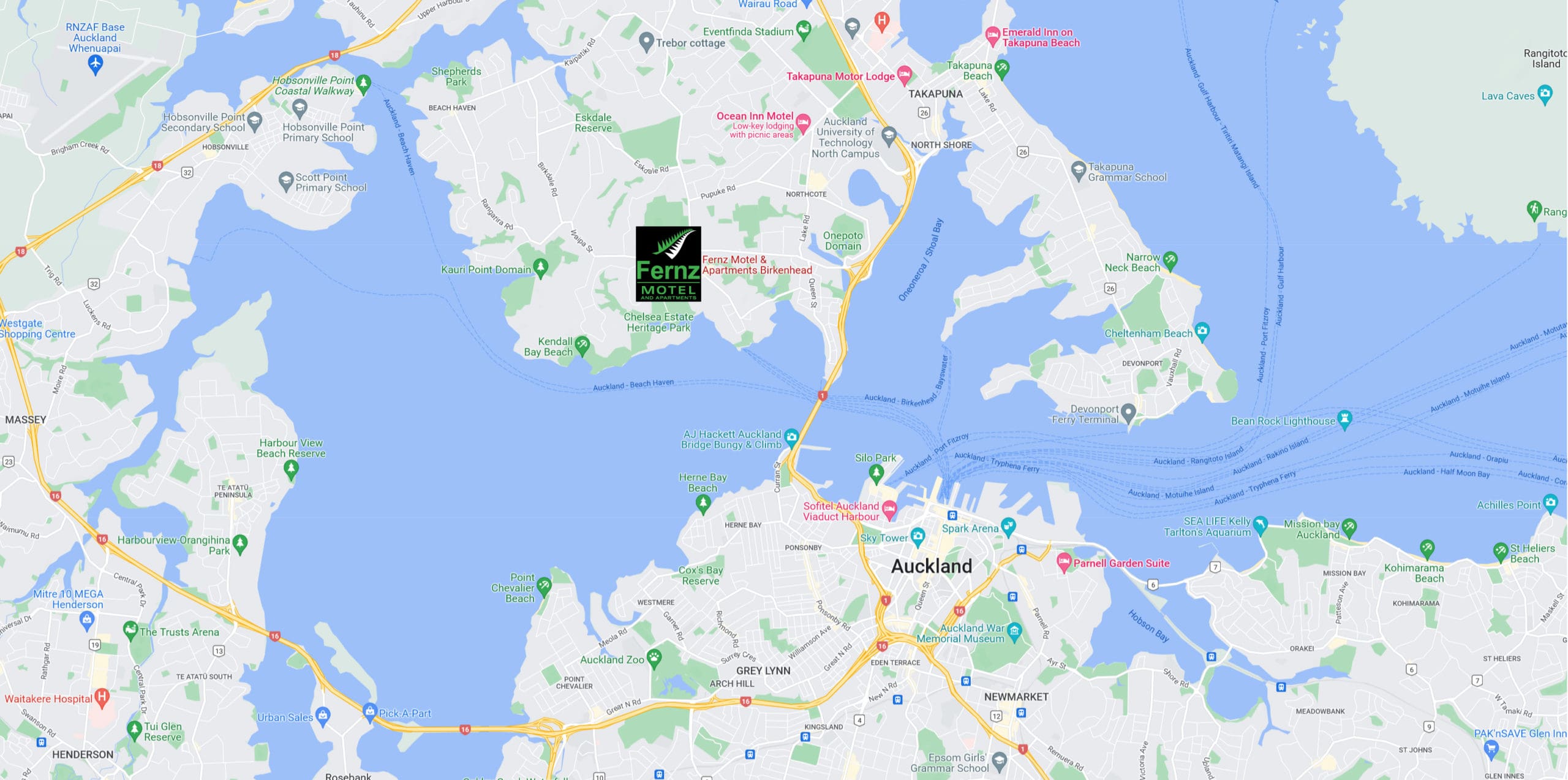 If travelling from the south, keep in the left-hand lane crossing the harbour bridge and take the 421 exit. Head west on Onewa Road/Route 27 for 2.1km. Turn left onto Birkenhead Ave (signs for Highbury) 250m. At the roundabout, take the 1st exit onto Hinemoa Sreet then turn right into Rawene Road. Fernz is on the right-hand side.